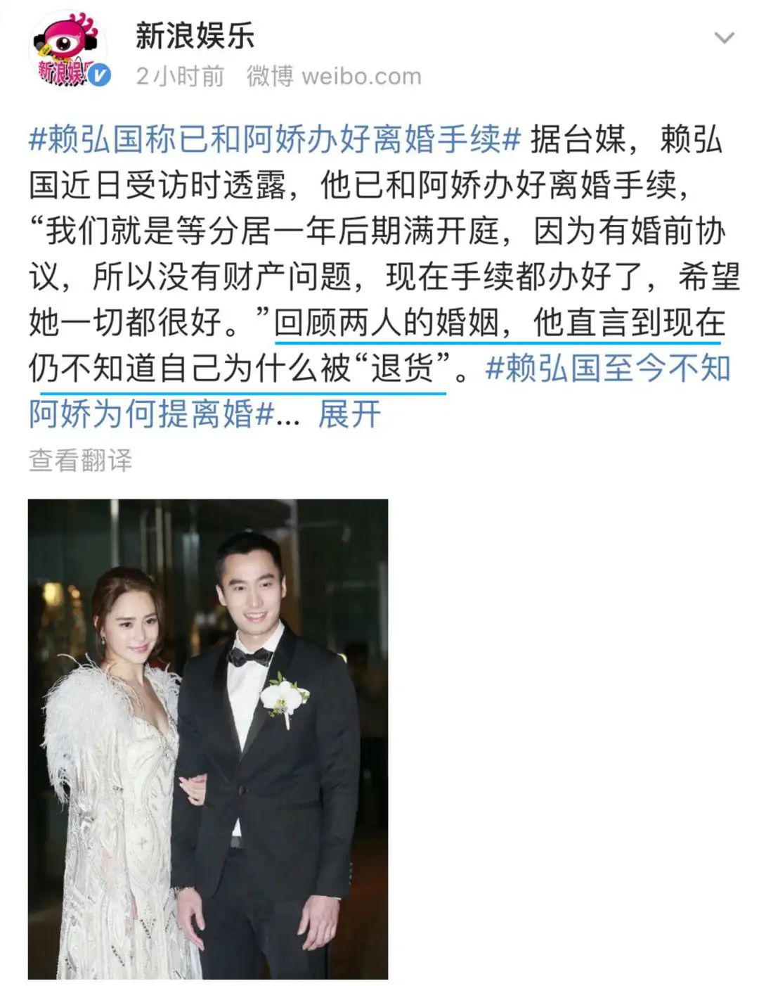 2020年3月,阿嬌和賴弘國一紙協議,結束了短短14個月的婚姻。