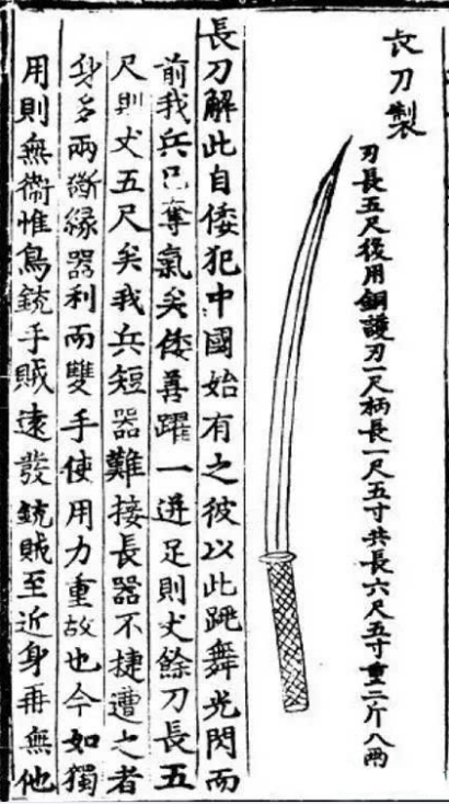 戚繼光確實有列裝仿日本野太刀的長刀,但是他在《紀效新書》裏也説的很清楚:“今如獨用則無衞,唯鳥銃手賊遠發銃,賊至近身,再無他器可以攻刺,如兼殺器,則銃重藥子又多,勢所不能。唯此刀輕而且長可以兼用,以備臨身棄銃用此,況有殺手當鋒,故用長刀備之耳。”這種仿日本刀只不過是火槍手拿來備用的,近戰肉搏部隊並不裝備。