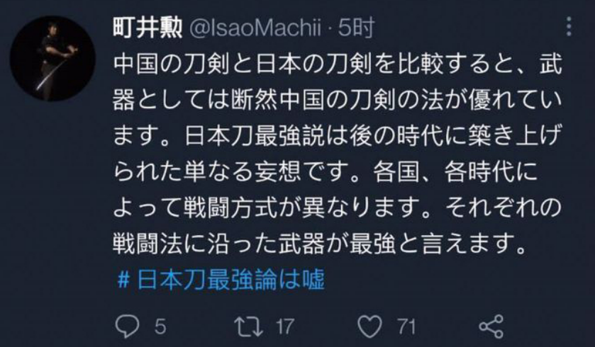 日本被稱為“平成武士”的著名居合術大師町井勳最近發了一個動態,明確的説明了他認為中國刀劍更加優秀,日本刀最強是謊言。全文翻譯:“如果把中國刀劍和日本刀劍相比,那麼作為武器而言當然是中國刀劍更加優秀。日本刀最強的説法不過僅僅是後世流傳中構建出來的妄想。根據國家和時代的不同,戰鬥方式也會不同。適應彼此不同戰法的武器才能被稱為是最強的。”町井勳自幼修習劍術與居合道,一人獨創六項吉尼斯紀錄,在中國都有很大的名氣。作為日本劍術的真大師,他的看法可以説是很有權威性了。而且他説的也很客觀,確實因為環境不同情況不同,適應性更強的武器才是最強的。