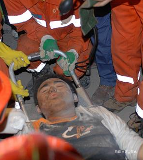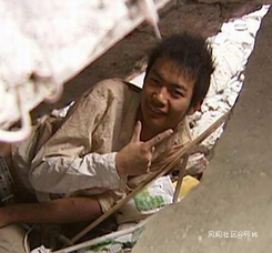 鄭海洋身處廢墟夾縫中超過22個小時,為了不讓救援人員擔心,在被救出的那一刻,透過縫隙擺出“勝利”的手勢。