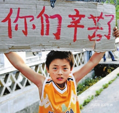 男孩徐廣手舉自制的“你們辛苦了”紙牌,感謝前來救援的官兵。