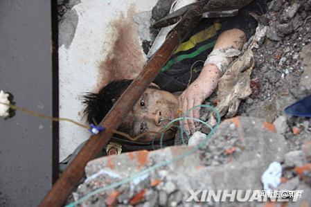 教師瞿萬容撲在地上,用後背牢牢地擋住了垮塌的水泥板,懷裏還緊緊抱着一名小孩,小孩獲救了,她卻永遠離開了。