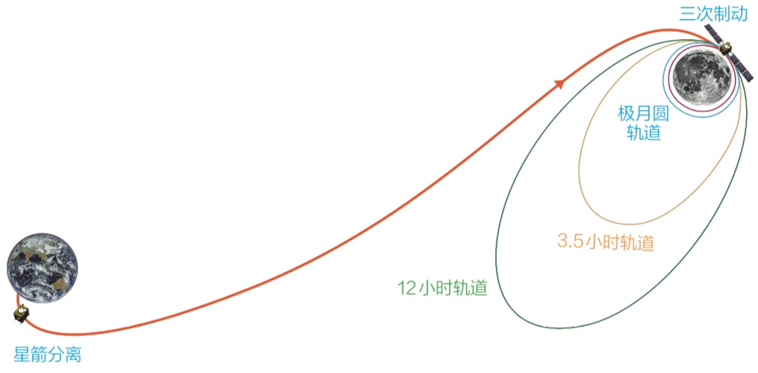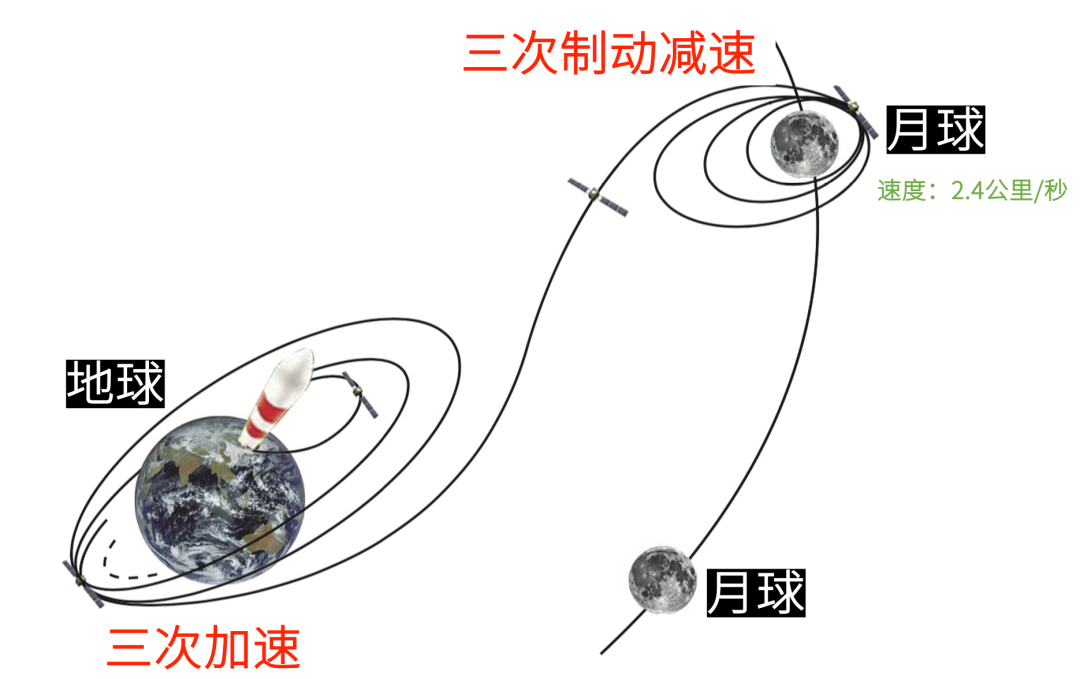 當它靠近月球時,速度大約是2.4公里/秒,如果這個時候不減速的話,它就會跟月球擦肩而過,飛向更遠的深空。所以我們就在此時又對它做了三次減速。