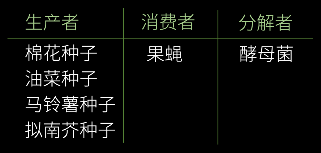 這六種生物都非常典型,大家可以發現,在一個密閉的裝置裏邊,這六種生物可以組成一個微型的生物系統,有生產者、消費者和分解者。