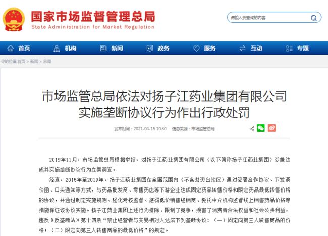 4月15日,因涉嫌壟斷,國家市場監管總局對揚子江藥業集團作出行政處罰。據揚子江藥業提供的審計報告,其2018年銷售額為254.67億元人民幣,對當事人處以2018年度銷售額3%罰款,計7.64億元。