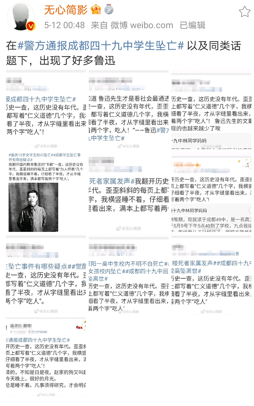 成都49中學生墜樓之後,全網的呼聲非常激烈,以至於學校、警方出了通告之後,大家依然表示不信任,在5月12日這個日子裏,全網都在刷一些“復讀機”式的內容,各種陰謀論漫天飛。