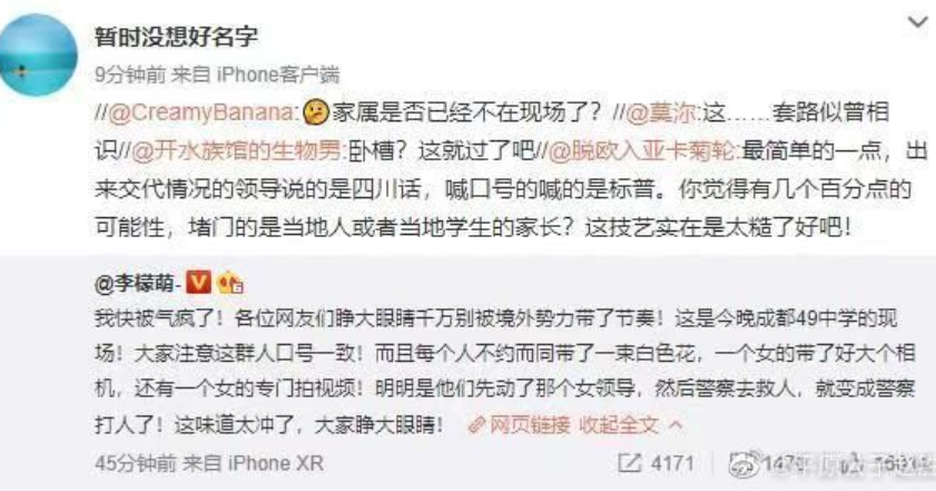 6、作為一箇中國人,我們都知道我們平時的維權是什麼樣子,家屬真的受了委屈,他們會拉上橫幅,披麻戴孝,撒紙錢,敲鑼打鼓,要學校給個公道……而不是家屬不在場,一羣莫名其妙的人舉着小白花,整整齊齊喊着口號,拍着照……另外,四川人一般是不説普通話的。
