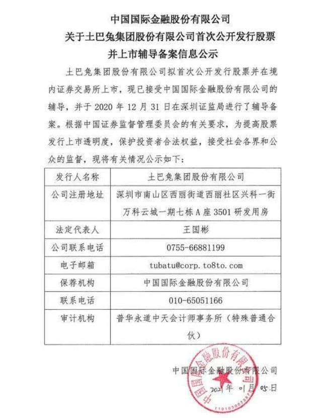 1月14日,土巴兔宣佈擬登陸A股。據公開信息,土巴兔日前已與中金公司簽署上市輔導協議,並於2020年12月31日在深圳證監局進行了輔導備案。