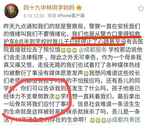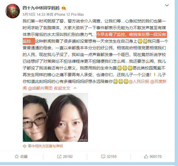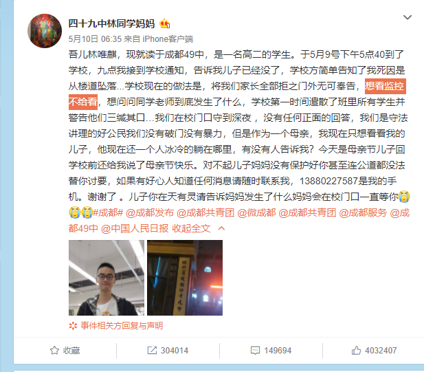 關於成都四十九中林某某墜亡的事情,現在憤怒的聲音已經夠多了,大多數採用的都是林某某媽媽在微博上的發言。