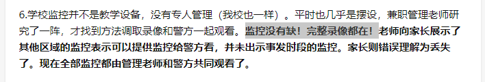 知乎上還有一位自稱大學同學在事發學校任教的答主@M5患者也表示“完整的監控錄像都在,並沒有缺失”