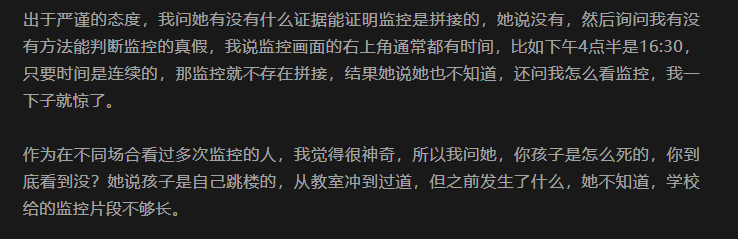 比如事發後,有一位名為@熠傑的媒體人,自稱打電話採訪了死者母親,死者母親在電話裏告訴他,學校給她看監控了,她也親眼看到了孩子從教室衝到過道跳樓的過程,但是學校給的監控時間不夠長,所以她沒看到之前發生了什麼。
