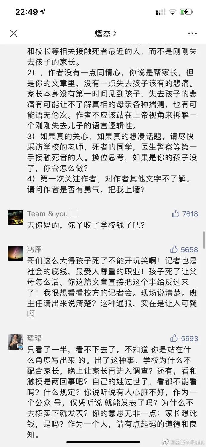 看到這,我猜已經有很多讀者按捺不住心中的憤怒,要大罵我冷血無情給校方警方洗地了,事實上上面那位自稱採訪了死者母親的博主,在朋友圈和評論裏被罵到了現在: