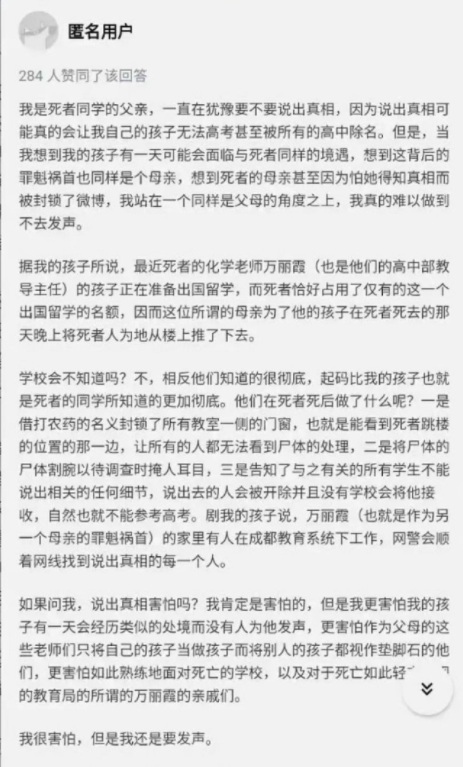 中間還有很多很多傳言,一會是另一個同學的爸爸匿名發帖,一會是同班同學説不敢講真相,反正真真假假,説啥的都有。