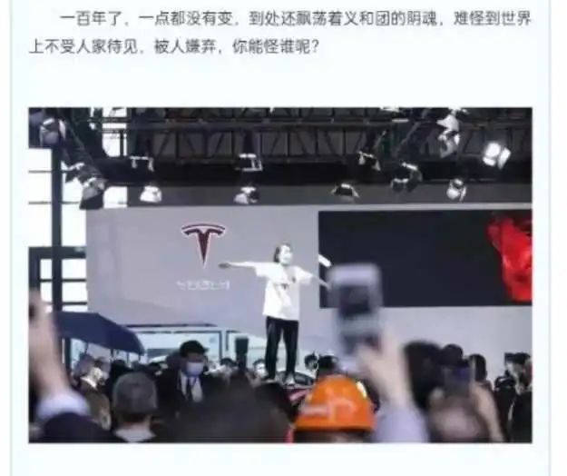 他們直接把特斯拉維權女車主罵成了“狗”,説她是被人操縱的“義和團”,圖片和文字惡劣至極,不但侮辱了中國女性,還侮辱了所有中國人,侮辱了中國近代史上為了追求民族獨立反抗帝國主義的鬥爭…….