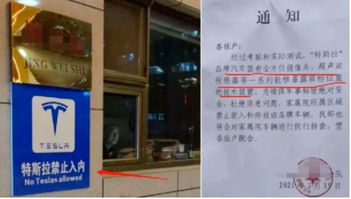 請大家注意一下這個小區的門衞崗亭和具體的通知內容:這是一個軍管單位,通知中明確寫着:“經過考察和實際測試,特斯拉品牌汽車裝有全方位攝像頭、超聲波傳感器等一系列能夠暴露目標位置的技術裝置,為確保軍事秘密絕對安全、杜絕隱患問題…..家屬院所屬區域內禁止駛入停放該品牌車輛”。