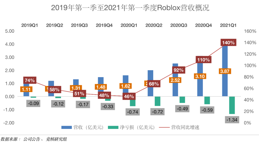 作為上市後第一期財報,2021年Q1期間,Roblox營收同比增長140%至3.87億美元,但仍處於虧損狀態。
