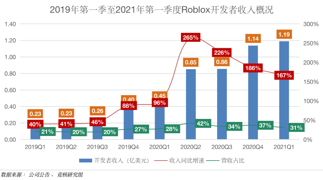 Roblox財報數據顯示,2021年Q1期間,Roblox開發者收入同比增長167%,高達1.19億美元。