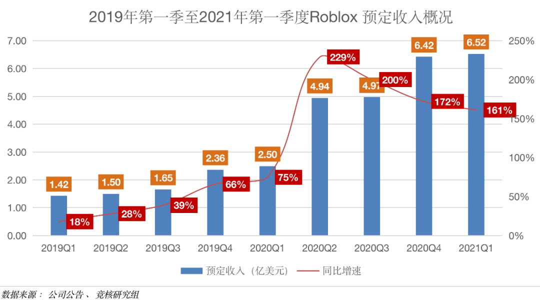 財報顯示,2021年Q1,Roblox預訂收入創歷史新高,達到6.52億美元,高於公司估計的5.50-5.75億美元。而此前,分析師認為調整後預訂收入約為5.758億美元。