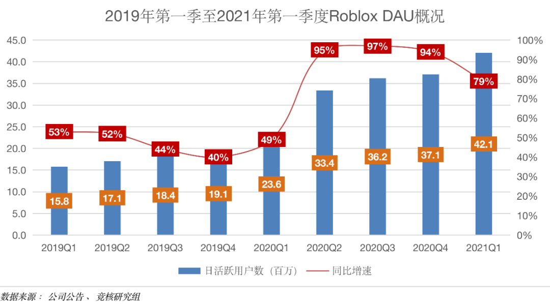 2021年一季度,Roblox日活躍用户數(DAU)為4210萬,同比增長79%。