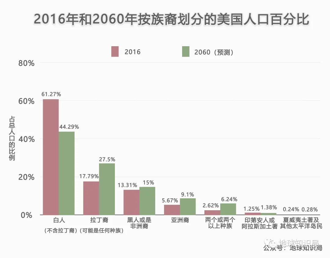 目前,美國非拉丁裔白人尚占人口的6成,預計2060年時會下降到4成多。拉丁裔將佔到近3成,亞裔將佔據近1成,非洲裔佔比略有上升。這將是美國前所未有的族裔結構。如今美國出現了清算曆史、拆毀雕像等種種國人看不懂的操作,其實都體現了國家文化根據族裔變化做出的調整。