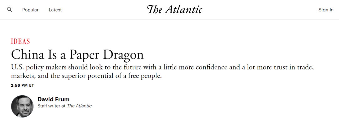 近日,美國《大西洋月刊》發表了一篇名為《中國是“紙龍”》的文章。