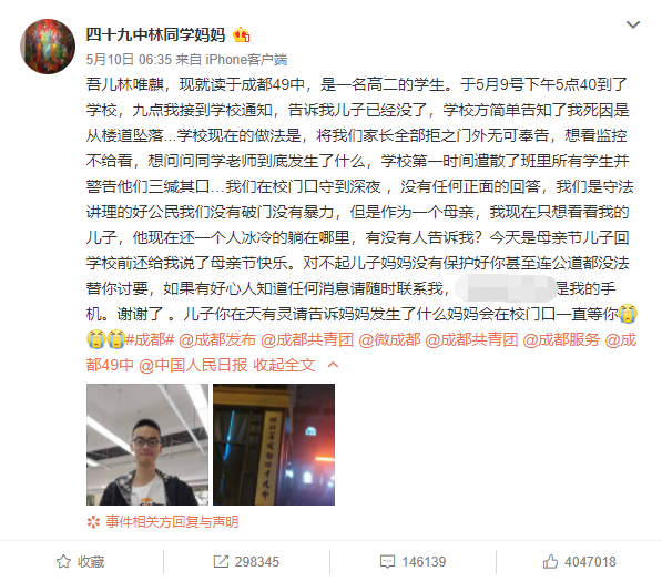 林媽媽説,自己在下午把兒子送到學校之後,晚上 9 點就收到了學校方面的通知 —— 自己的兒子從樓道墜落,已經去世了。