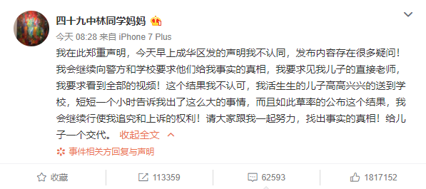 其中最關鍵引起網友們情緒的**“ 不讓進學校 ”和“ 不給看監控 ”**,都有着和微博上截然不同的説法。