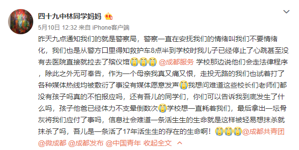 接下來林媽媽的一條微博就更讓人氣憤了,她説林同學在事發之後直接就被救護車拉到了殯儀館,學校那邊希望走法律途徑解決,其他事情無可奉告。。。