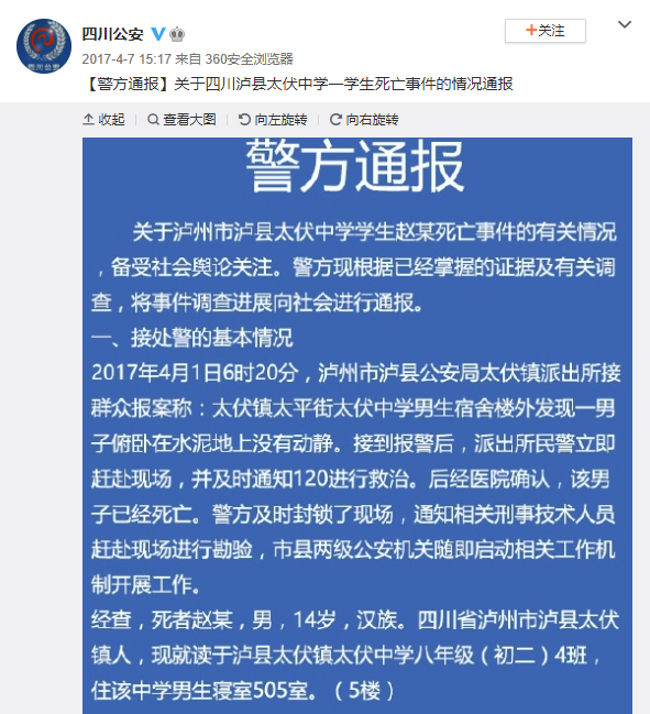 同樣是應對學生墜樓事件,四年前四川瀘縣太伏中學的警方通報,就顯得詳細了許多。