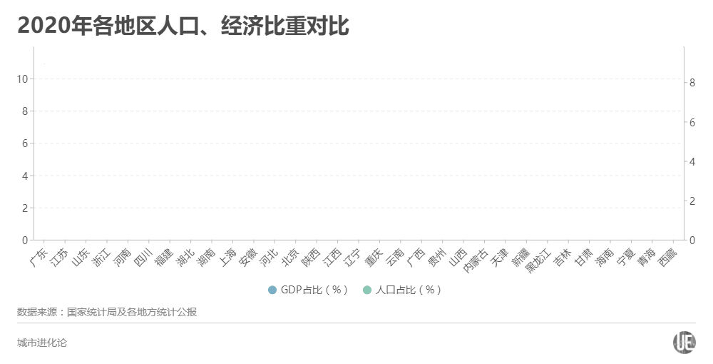 城叔做了一個對比,以31個省區市2020年的經濟數據和人口數據看,有廣東、江蘇、山東、浙江、福建、湖北、上海、北京、重慶、內蒙古、天津10個省份的經濟總量佔比大於(等於)人口總量佔比。