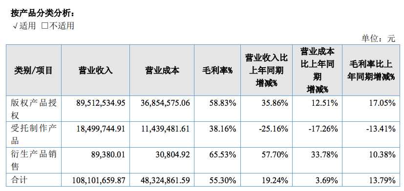 妙音動漫主營各類動漫影視作品,包括原創、受託製作以及開發衍生品,2020年它的1.08億元收入中,授權、製作、衍生產品的收入為別為8951.25萬、1849.97萬、8.94萬元,版權產品授權收入同比增加35.86%,受託製作收入同比減少25.16%。