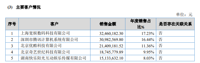 傑外動漫的前五大客户分別是B站、騰訊、優酷、愛奇藝、芒果TV,2020年它們分別貢獻銷售額3246.02萬、3098.26萬、2140.92萬、1874.58萬、1513.36萬元。