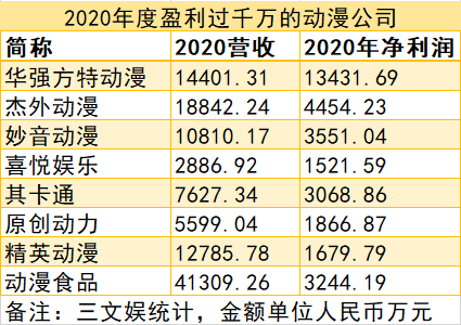 根據統計,在發佈了數據的約40家主營業務包括動畫漫畫的公司中,大多數出現收入下降現象,盈利的有十多家,佔比約1/3;年度淨利潤過千萬的,有華強方特動漫、原創動力、其卡通、傑外動漫、妙音動漫、唯諾冠、喜悦娛樂這幾家(三文娛《年營收過億的10家玩具公司》一文,已對精英動漫做過分析)。