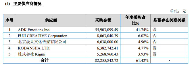 2020年,傑外動漫最大的供應商是ADK,其次是富士電視台旗下版權分銷公司。這一年傑外動漫向ADK、富士、講談社採購金額分別為5590.3萬、896.3萬、638.27萬元。