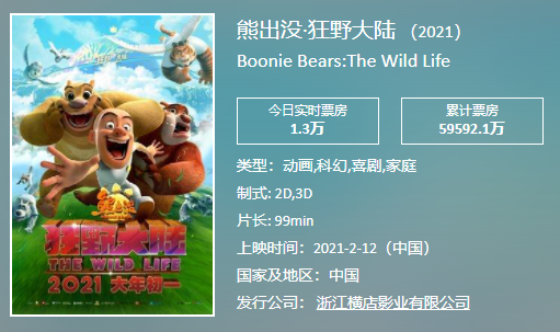 《熊出沒•狂野大陸》撤檔後改至2021年上映,票房近6億元