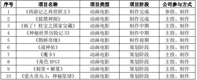 其中,《搖擺神探》製作完成,《瘋了!桂寶之國家寶藏》與《神秘世界歷險記 5》在製作中期,《鵲橋奇緣》在製作前期,《戰神佑》《魔卡》《角色RPG》《刺青·解夏》《螢火奇兵3:神秘星球》這5部在策劃階段。