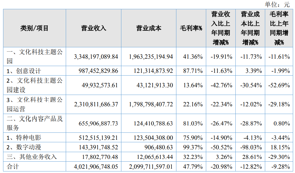 2020 年,華強方特文化科技集團股份有限公司(以下簡稱華強方特集團)實現營業收入40.22億元,同比下降20.98%;淨利潤5.28億元,同比下降38.84%。