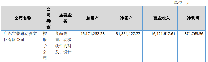 唯諾冠於2015年11月併購汕頭市天億馬動漫文化有限公司,後更名為廣東寶袋豬動漫文化有限公司,後者經營食品銷售和動漫研發、設計。2019年營業收入為1275.37萬元,淨利潤169.88萬元;2020年營收1642.16萬,淨利潤87.18萬元。