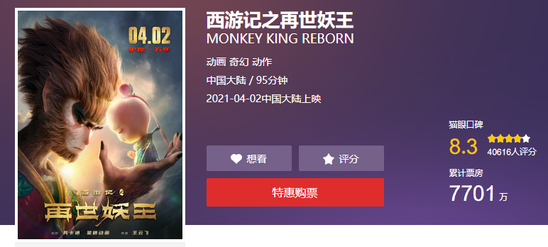 4月2日,《西遊記之再世妖王》上映,目前票房約1.12億元。