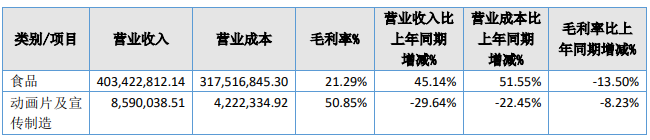 2020年度,唯諾冠的收入中,來自食品的有4.03億元,來自動畫片及宣傳製造的只有859萬元,佔比較低。