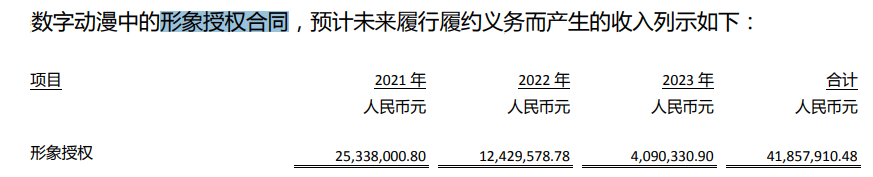 華強方特集團的未履行的數字動漫形象授權合同,2021-2023年預計將因客户履約而產生收入4185.79萬元。