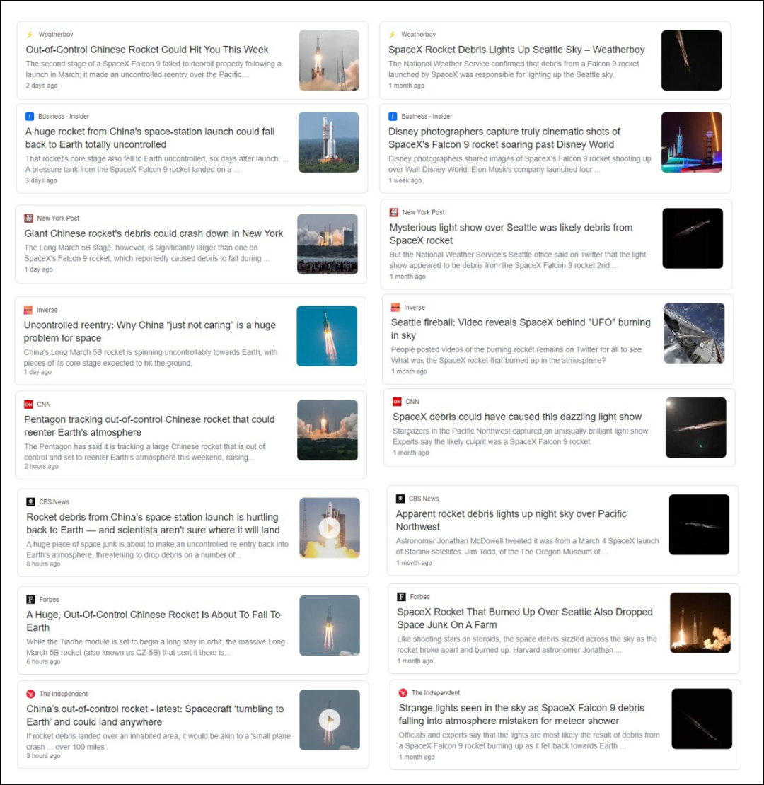 一樣的事情,此前馬斯克的SpaceX公司“獵鷹9”火箭殘骸掉落,同樣的美媒,浪漫地描述為“點亮星空”、“太壯觀了”、“炫目燈光秀”;而對於中國火箭,那就是“太空垃圾”、“失控墜落”、“可能砸中紐約”……