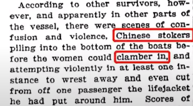 《紐約時報》最先報道,“有人提到意大利和中國爐工的暴烈舉動,他們從甲板跳進救生艇,踩傷了艇中的女乘客”,同時又自相矛盾地寫道,“中國司爐工搶在婦女們之前蜂擁而入救生艇。”