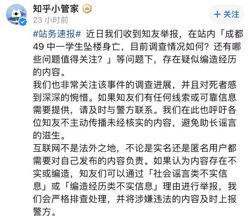 此前,在知乎“成都49中一學生墜樓身亡,目前調查情況如何?還有哪些問題值得關注?”等問題下,有用户自稱是死者同學,但隨後該用户被發現曾於2019年自稱大一,與死者林某高二學生的身份不符。