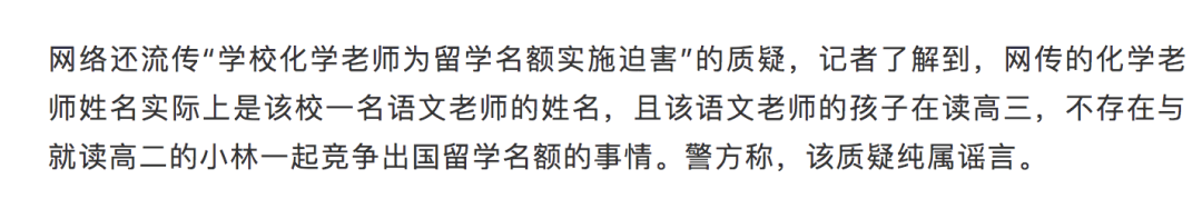 13日凌晨,新華社公佈的事件調查詳情對這一謠言也做出了回應:該語文老師的孩子在讀高三,不存在與就讀高二的小林一起競爭出國留學名額的事情。警方稱,該質疑純屬謠言。
