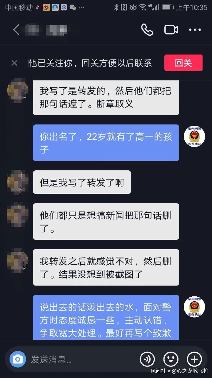 在泉州網警曬出的截圖中,該網民稱謠言系轉發,非原創,“轉發之後就感覺不對,然後刪了”。