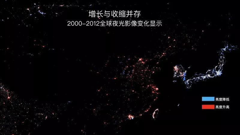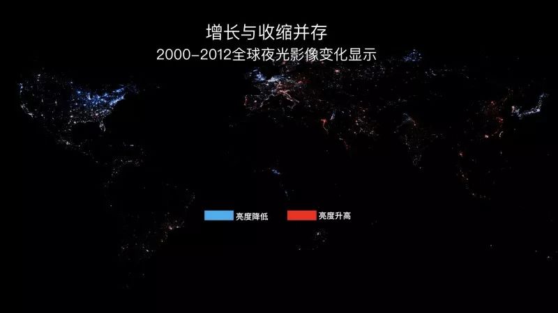 這是我們最新的一個研究:通過全球夜光變化的影像,我們發現早在2000年到2012年間,西歐、北美,包括東亞的日本、韓國,很多地區都在發生大面積的人口流失,雖然夜光影像只能反映社會經濟的綜合強度或密度在下降,但是,基本上跟人口流失呈現出很強的正比例。
