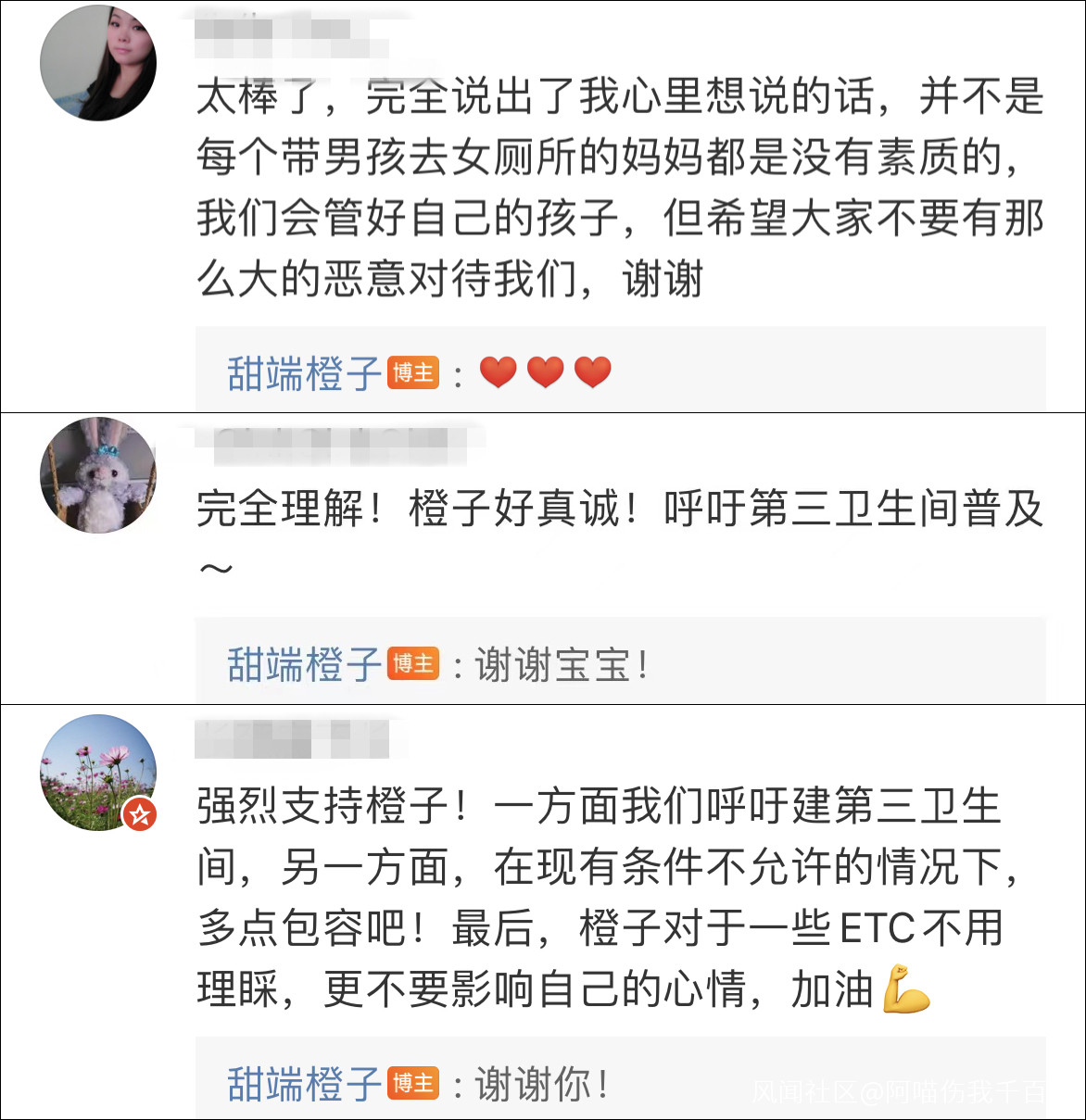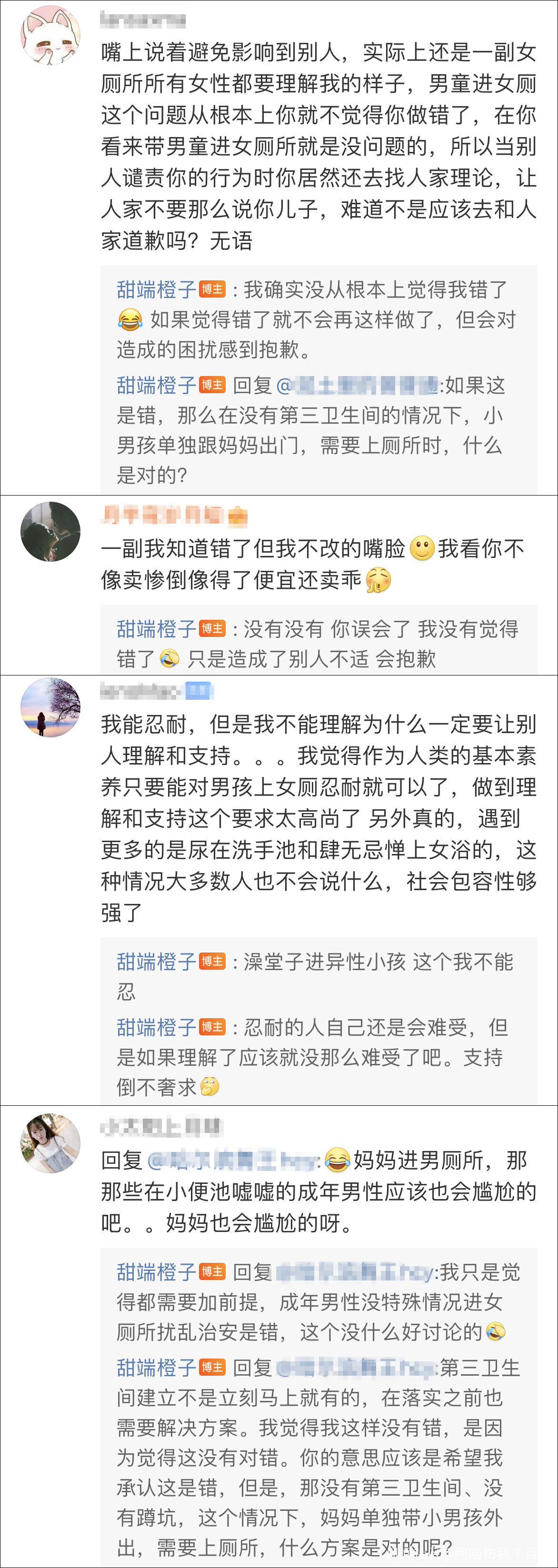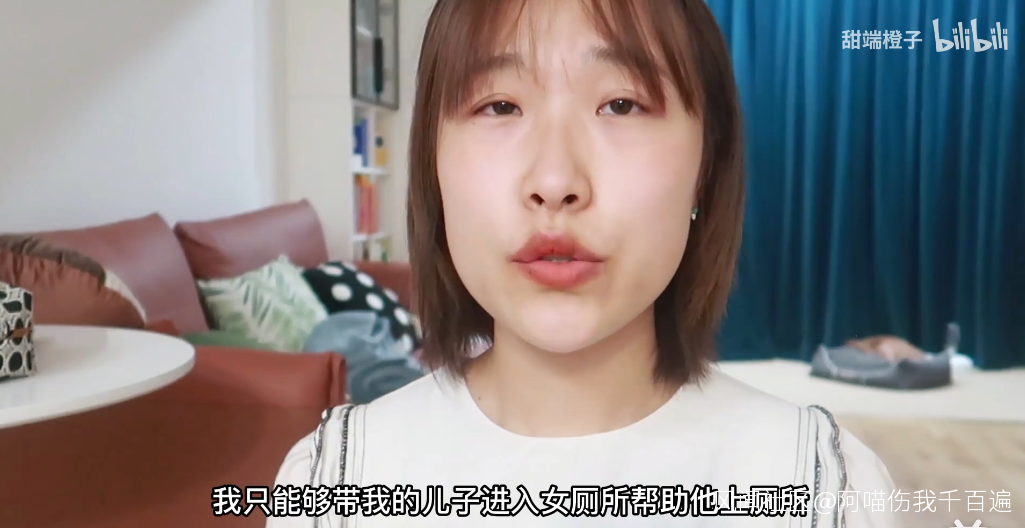 隨後一名育兒博主“甜端橙子”的視頻引發關注,她是一位有着3歲兒子的媽媽,在沒有親子廁所、第三性別廁所等迫不得已的情況下,也帶兒子上過女廁所。