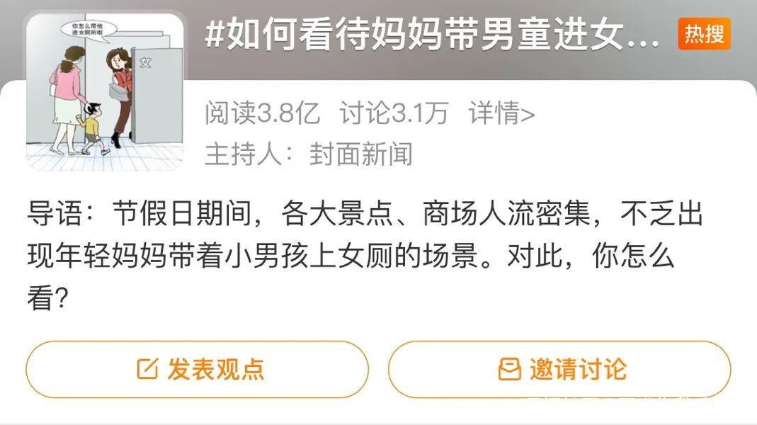 “如何看待媽媽帶男童進入女廁”的話題登上熱搜,引發各方討論。