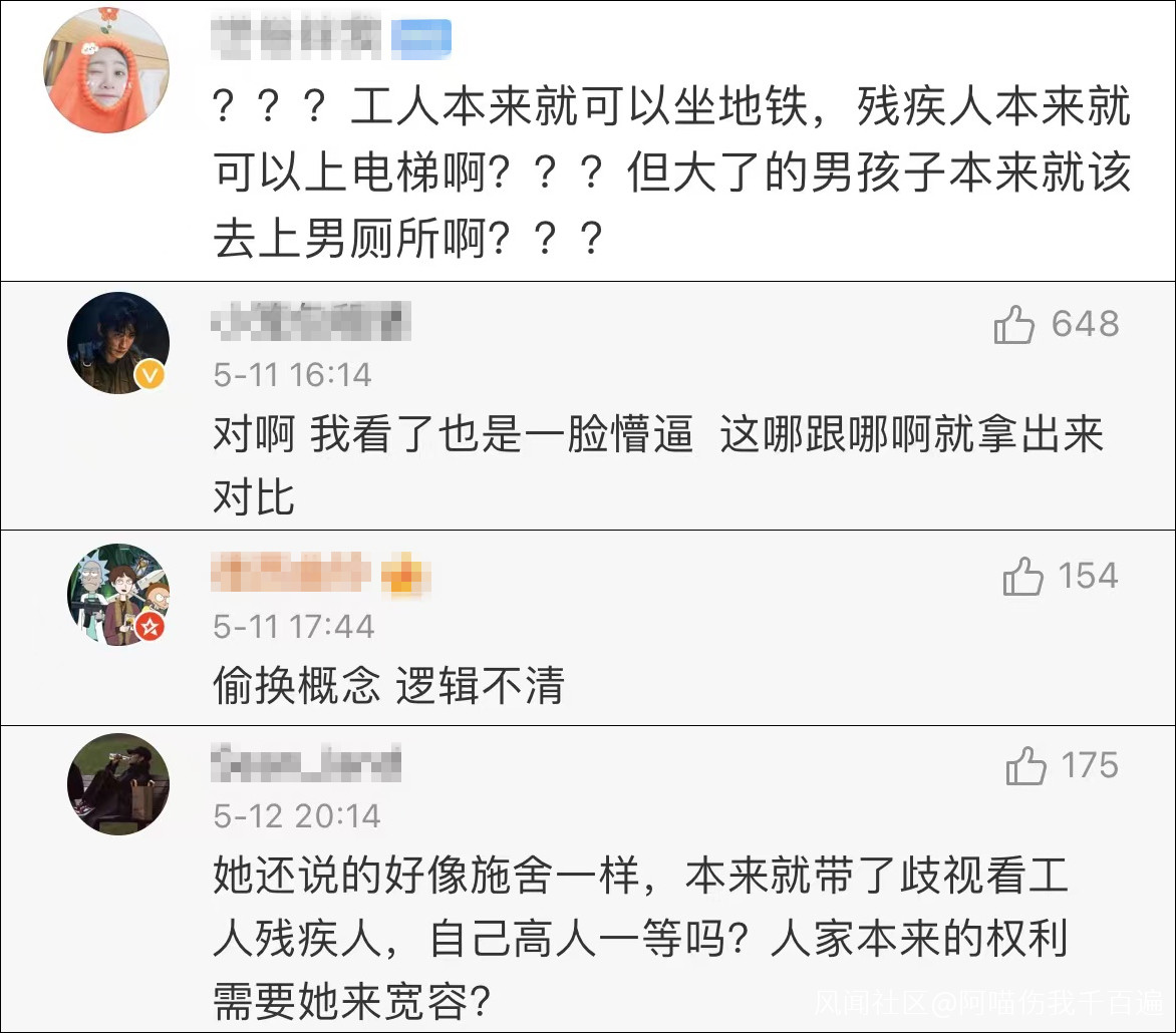 這番類比令不少網友直呼迷惑:工人本來就可以坐地鐵,殘障人士本來就可以坐電梯,這都是人家的合法權益。可男孩不應該上女廁啊?